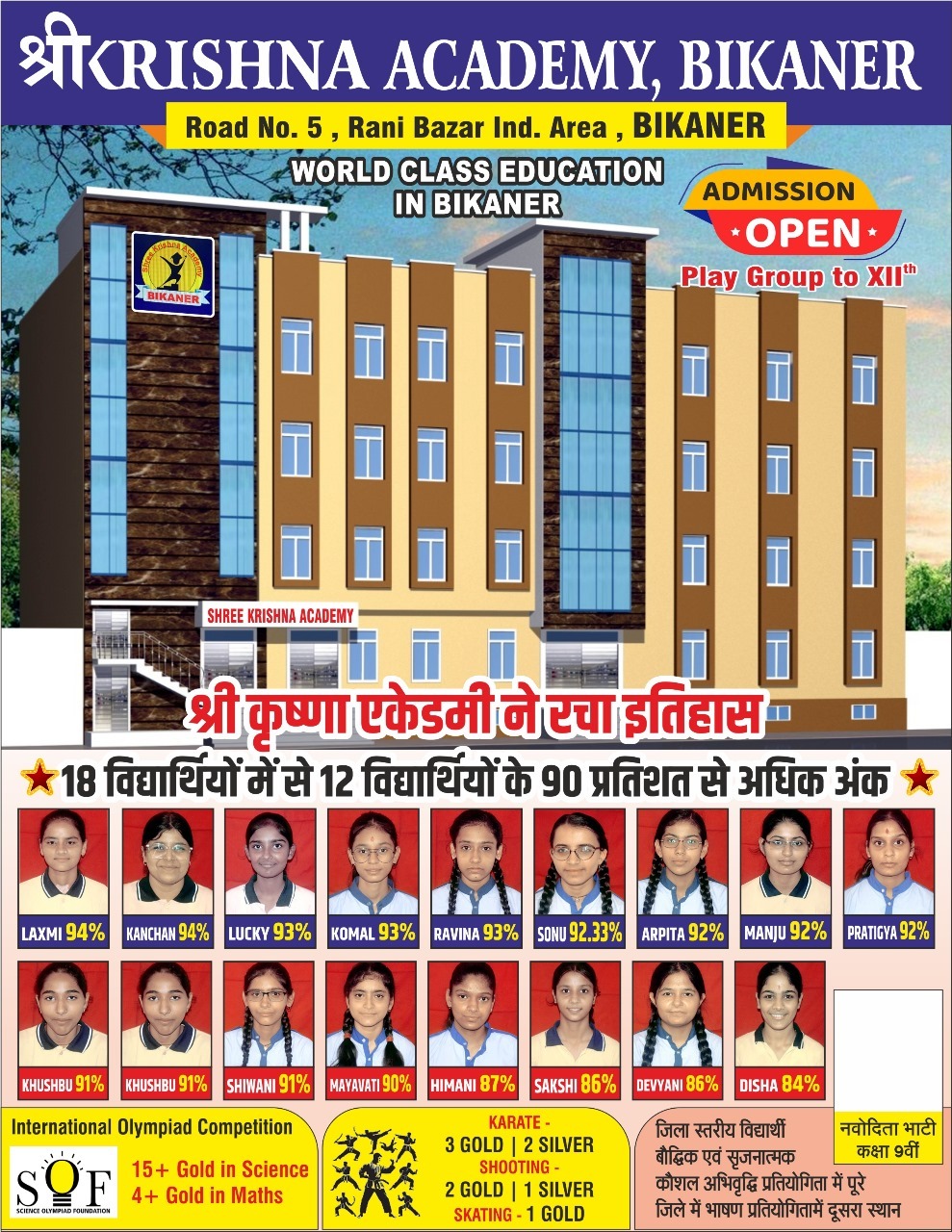 Shree Krishna Academy was founded by an established educationist and defense personnel with the intention of imparting quality education in the true sense of the word. This includes not only maintaining formidable academic standards but also nurturing all faculties - intellectual, physical, and spiritual. Today, the school has emerged as one of the most distinguished schools in the city in all aspects.